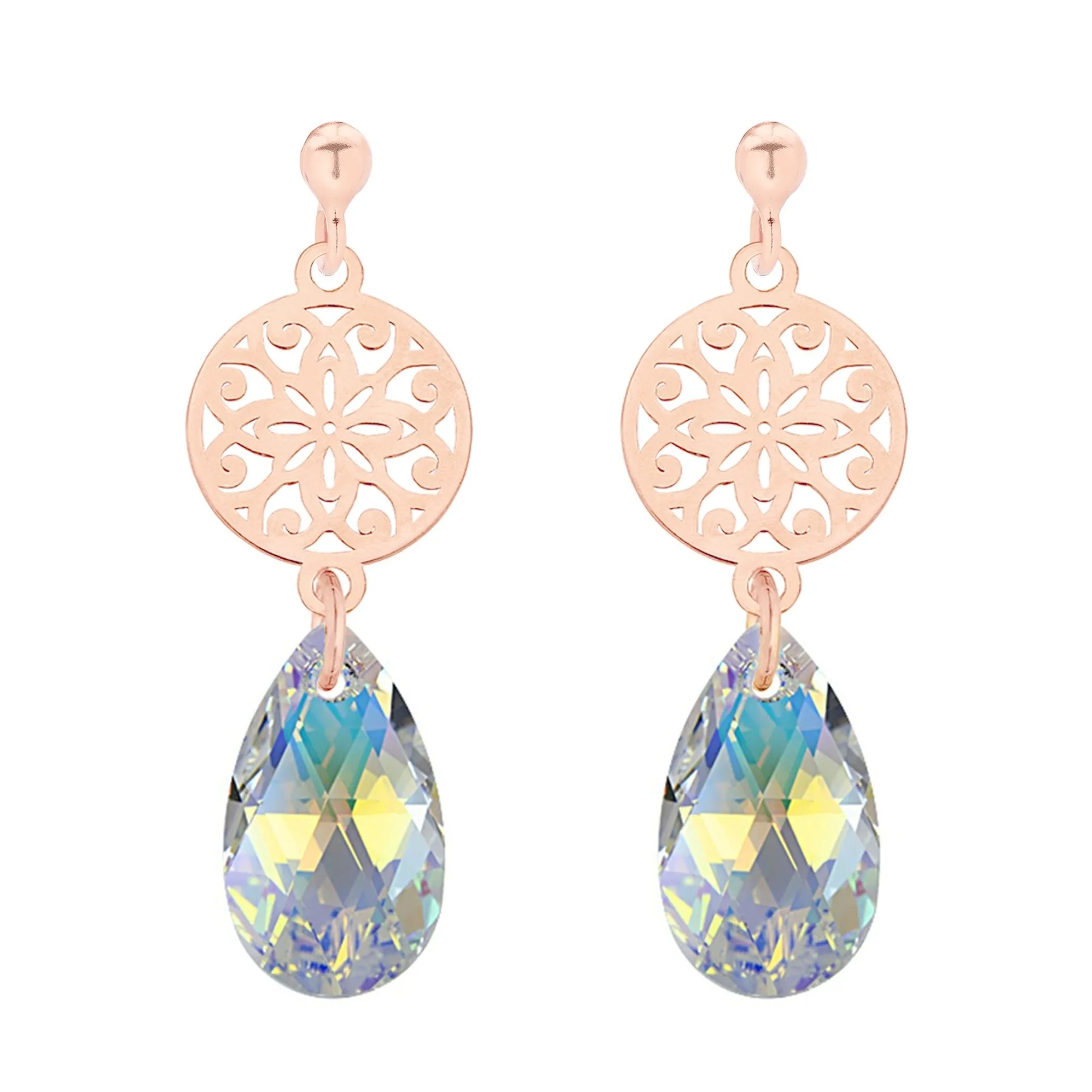 Złote kolczyki wykonane z ażurowych rozet i kryształów SWAROVSKI® CRYSTAL w kolorze Crystal AB. Całość wykonana ze srebra 925 powlekanego 24 karatowym żółtym złotem. Zapinane na sztyft.