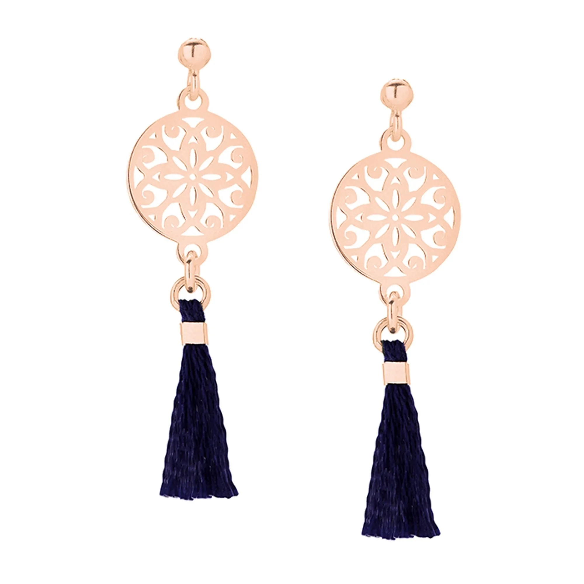 Złote kolczyki wykonane z arabskich rozetek i granatowych chwościków. Całość wykonana ze srebra 925 powlekanego 24 karatowym żółtym złotem. Zapinane na sztyft