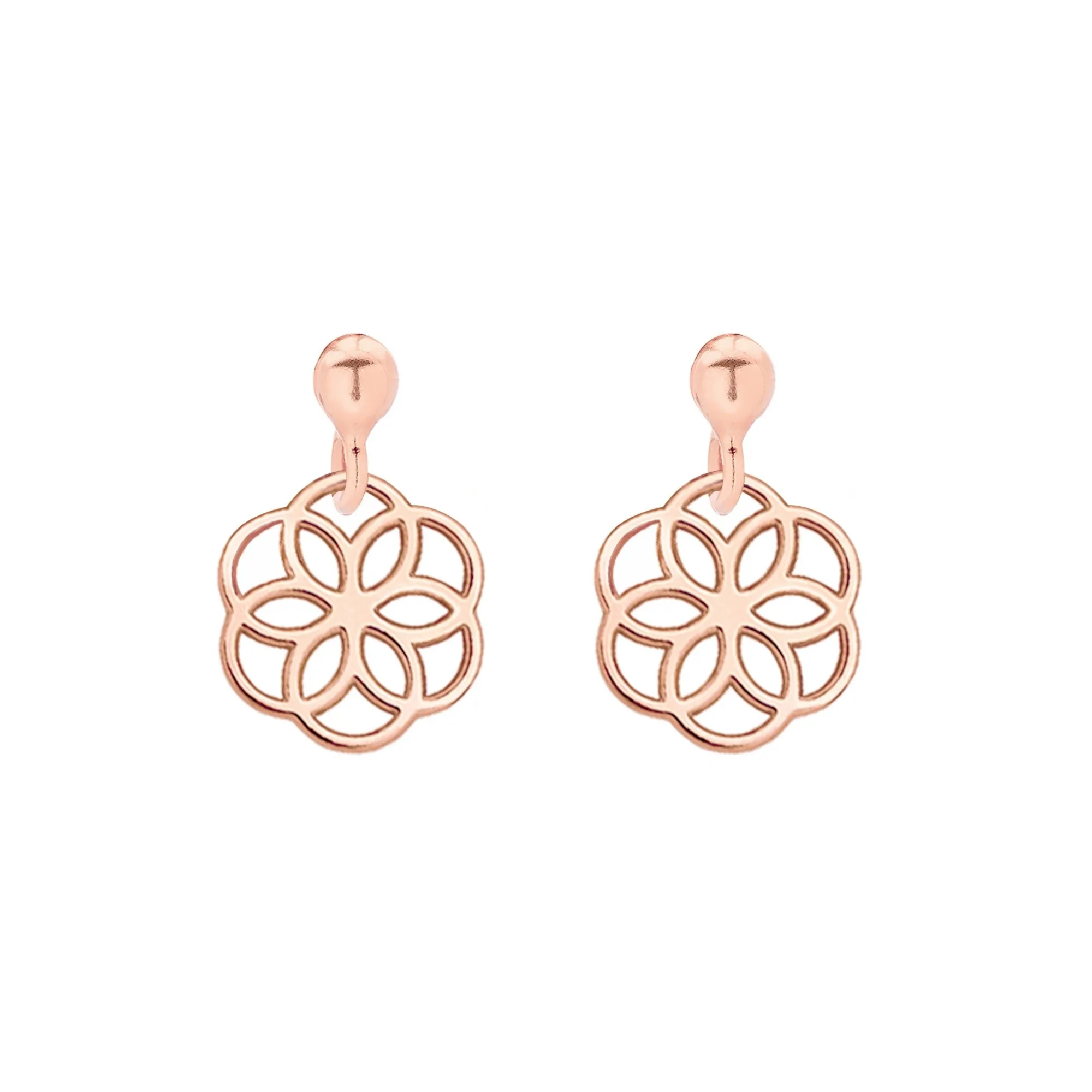 Złote kolczyki zdobione rozetkami. Całość wykonana ze srebra 925 powlekanego 24 karatowym żółtym złotem. Zapinane na sztyft.