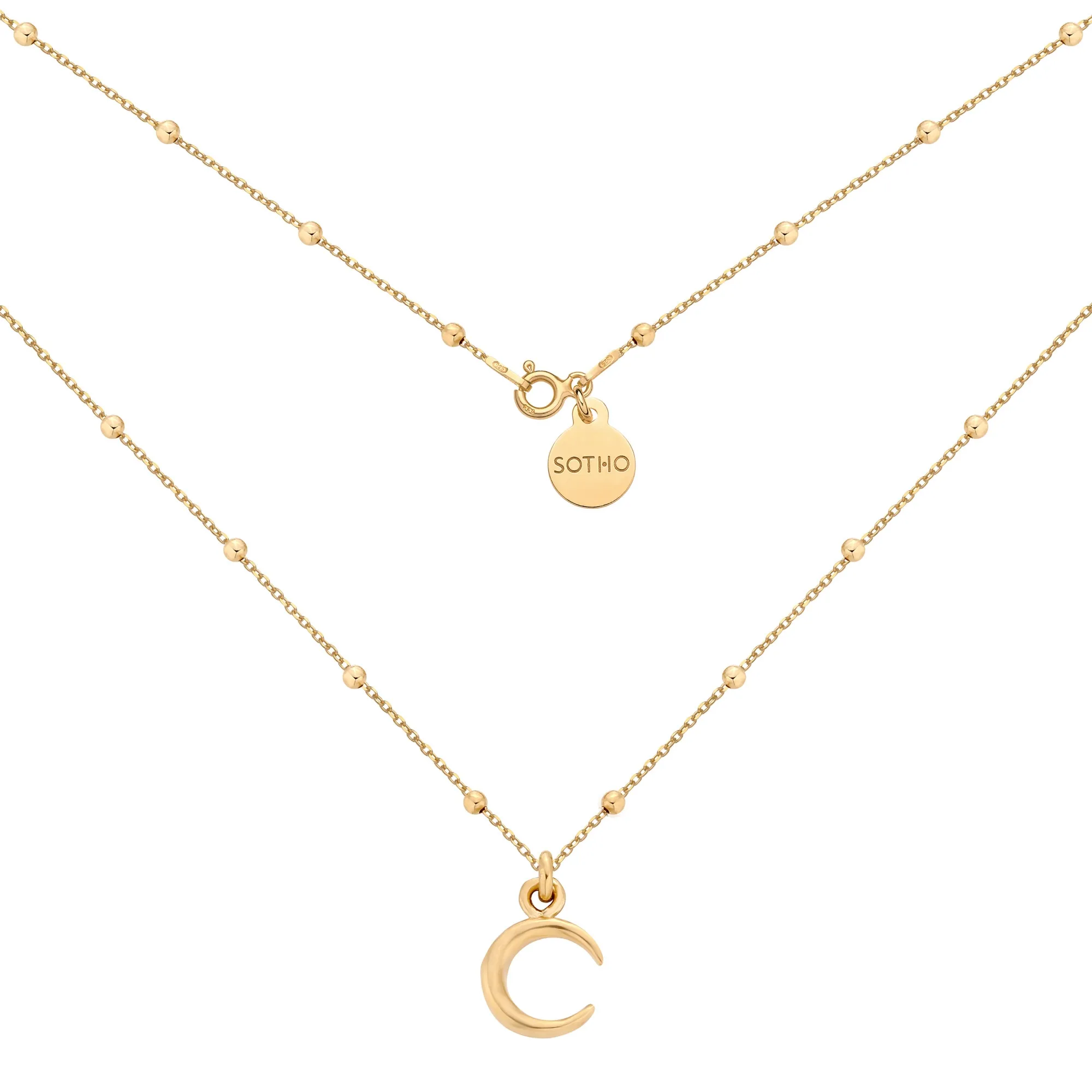 Złoty kuleczkowy naszyjnik zdobiony księżycem i zawieszką z logo marki. Całość wykonana ze srebra 925 powlekanego 24 karatowym żółtym złotem. Długość naszyjnika do wyboru 40 lub 45 cm Grubość łańcuszka 1 mm Kulka 2 mm Księżyc 12,7 x 10,1 mm Zawieszka z logo 10 mm Produkt o wadze poniżej 5 g. Zapakowany w eleganckie pudełeczko z logo marki. Posiada logowaną metkę. Istnieje możliwość zamówienia naszyjnika innej długości, z innym modelem zawieszki, z kilkoma zawieszkami, na innym modelu łańcuszka, w wersji ze srebra 925 lub srebra 925 powlekanego 24 karatowym różowym złotem, z dodatkowymi kamieniami, perłami lub kryształami SWAROVSKI® CRYSTAL itp.