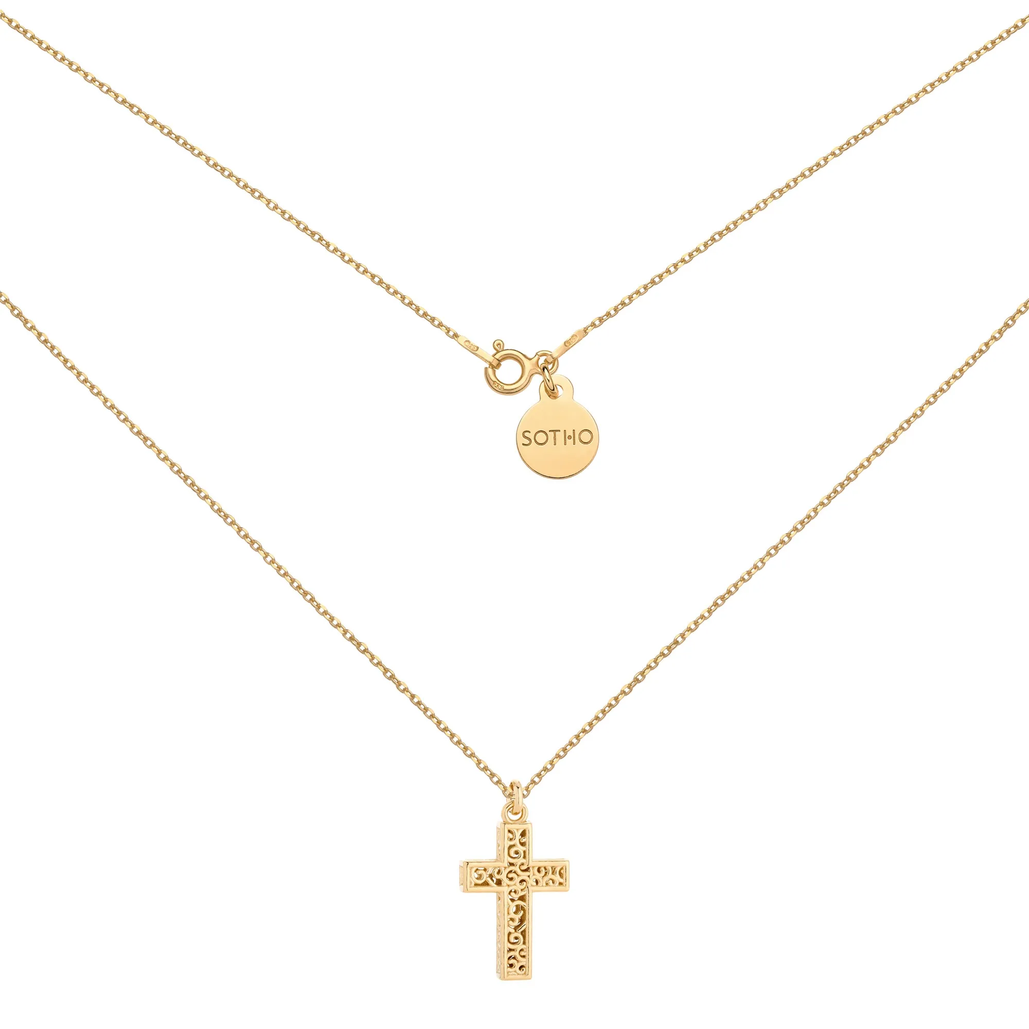 Złoty naszyjnik łańcuszkowy zdobiony masywnym, ażurowym krzyżem i zawieszką z logo marki. Całość wykonana ze srebra 925 powlekanego 24 karatowym żółtym złotem. Długość naszyjnika do wyboru 38, 40, 45, 50, 60 lub 70cm Grubość łańcuszka 1 mm Krzyż 18 x 10 mm Zawieszka z logo 10 mm Produkt o wadze poniżej 5 g. Zapakowany w eleganckie pudełeczko z logo marki. Posiada logowaną metkę. Istnieje możliwość zamówienia naszyjnika z innym modelem zawieszki, z kilkoma zawieszkami, na innym modelu łańcuszka, w wersji ze srebra 925 lub srebra 925 powlekanego 24 karatowym różowym złotem, z dodatkowymi kamieniami, perłami lub kryształami SWAROVSKI® CRYSTAL itp.