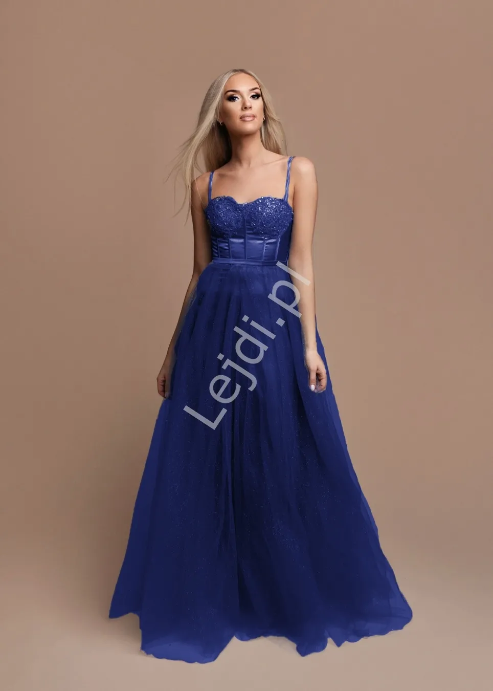 Granatowa sukienka wieczorowa z tiulu z brokatem, długa suknia gorsetowa na wesele, na bal, studniówkę 2357
