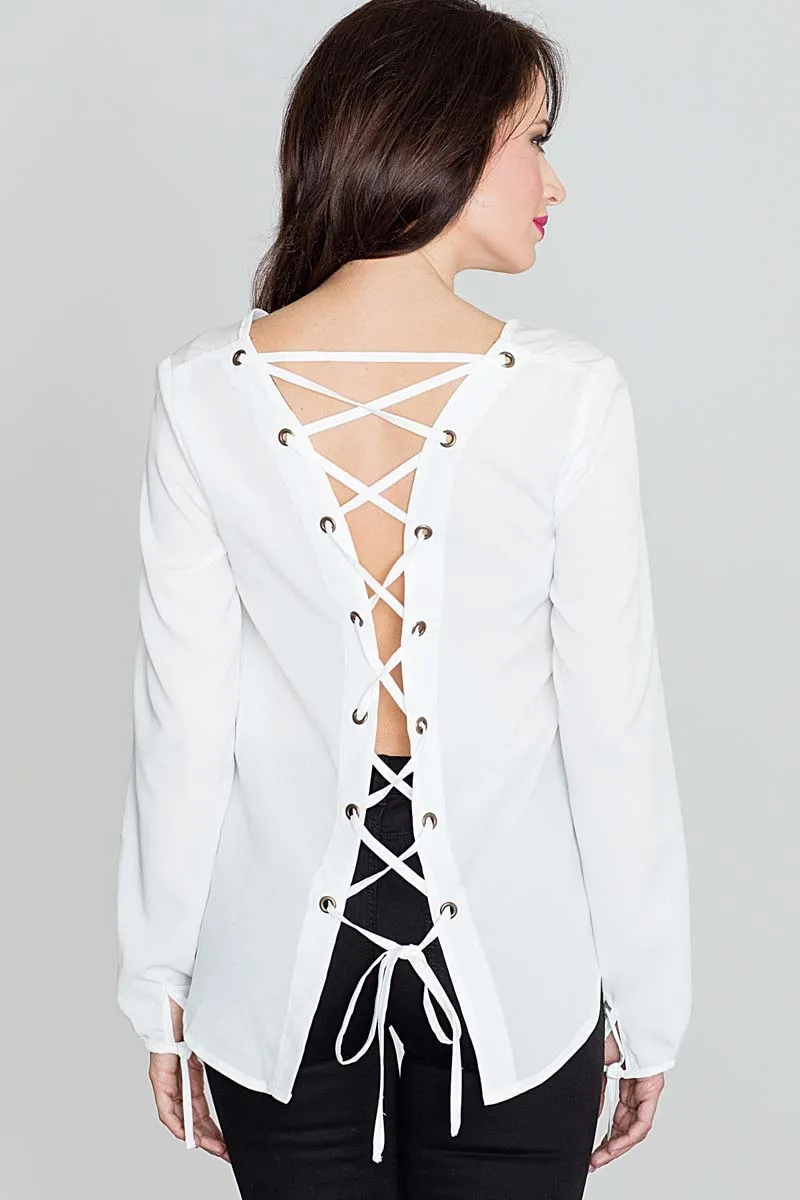 Modna Ecru Bluzka z Dekoltem „V” Sznurowana na Plecach
