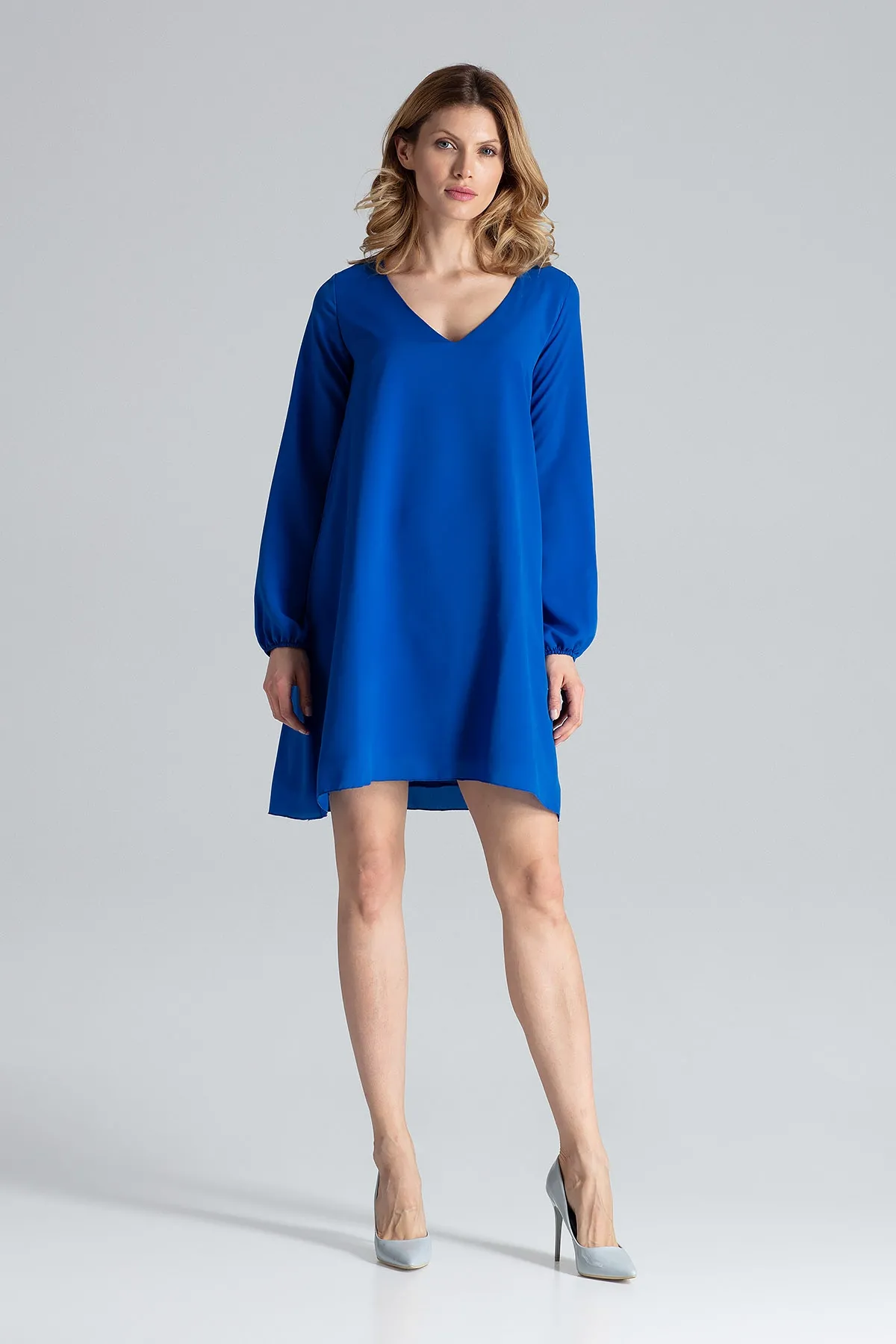 Niebieska Sukienka Trapezowa z Długim Rękawem