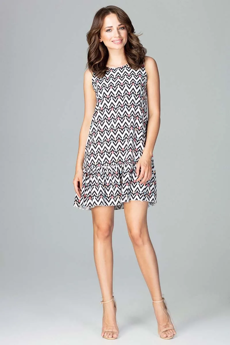 Zwiewna Czarno Biała Sukienka z Wzorem Wykończona Falbanką