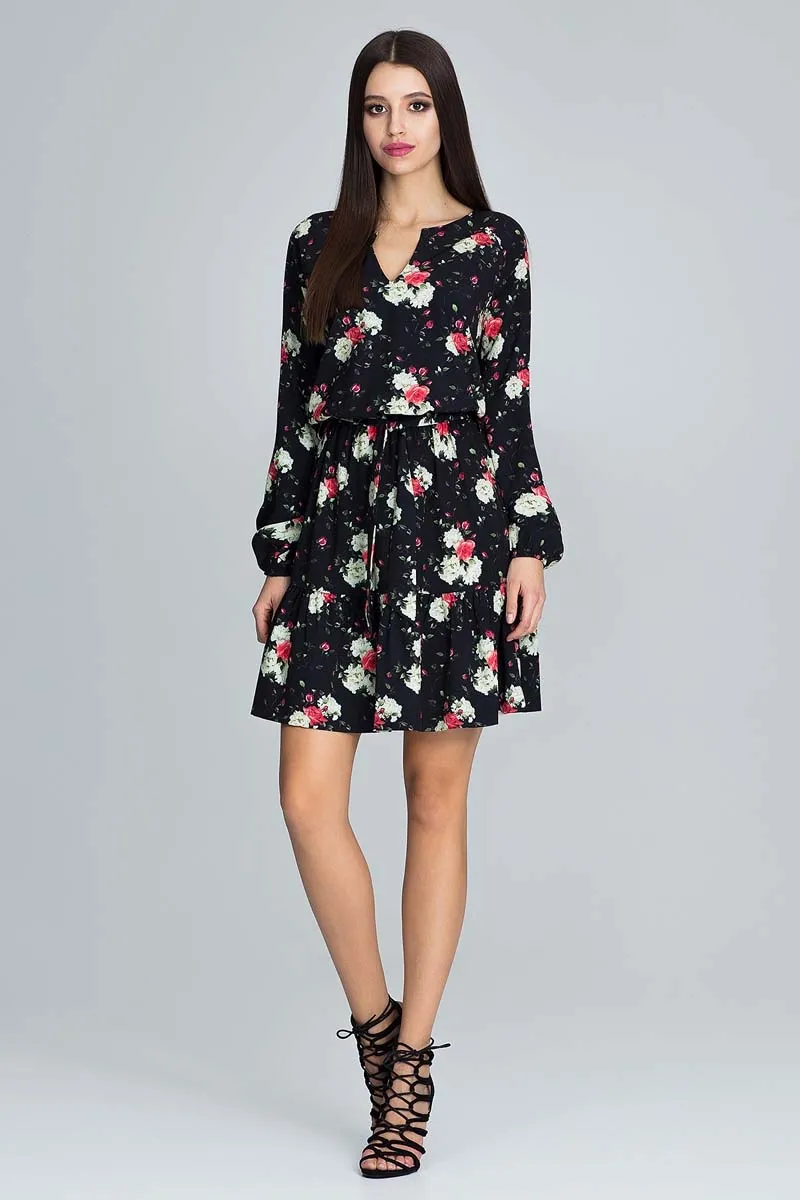Zwiewna Wzorzysta Sukienka z Bufiastym Rękawem z Paskiem - Wzór 75